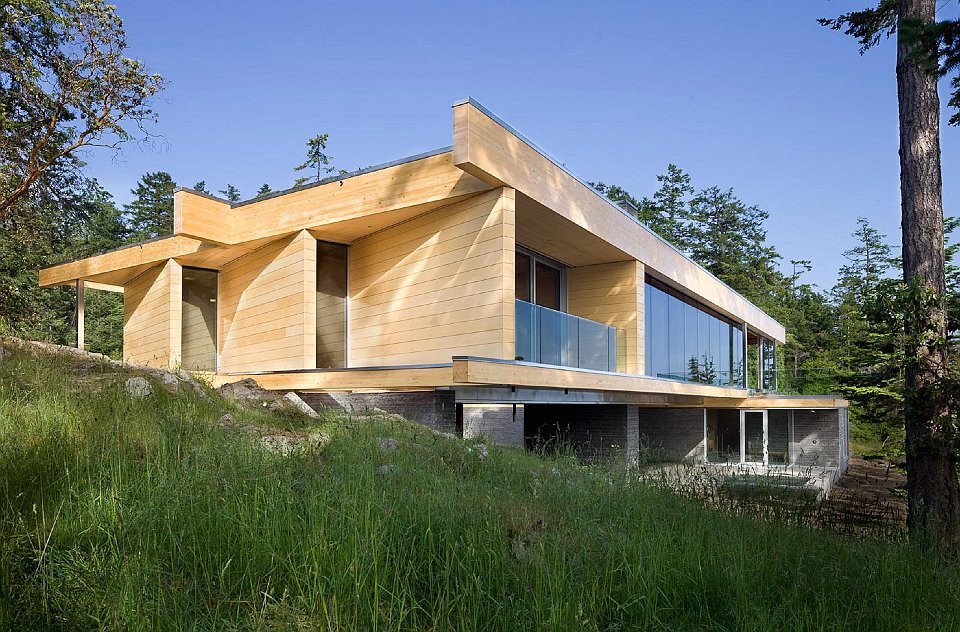 ビーチフロントの岬に立つ美しい現代風ハイブリッド木造住宅。バンクーバー島産の米松使用した、伝統的な接合方式による木造フレーム構造。
